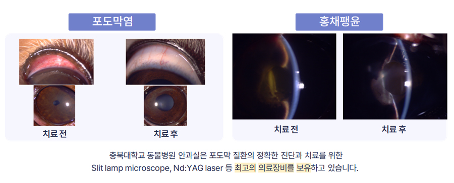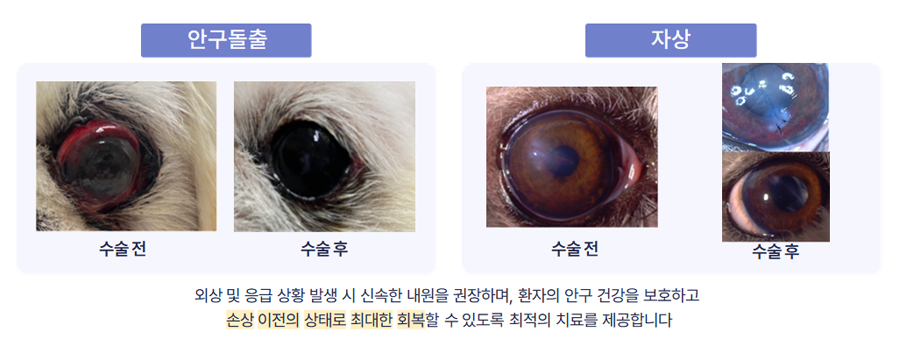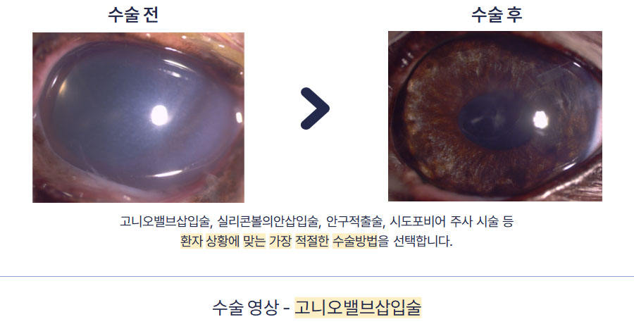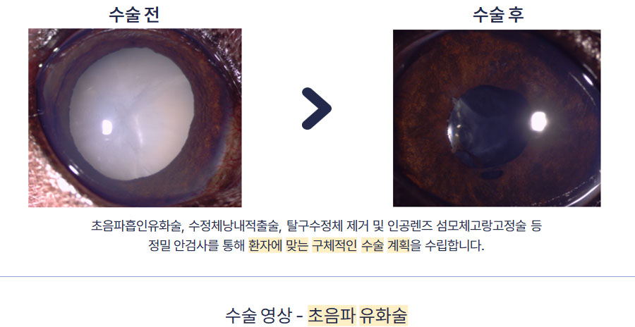 백내장의 진행단계는 초기 (1기) 에는 혼탁이 시작되는 시기로 시력은 정상이며 동물에서는 사람과 달리 일반적으로 수술이 필요하지는 않습니다. 미숙기 (2기) 에는 혼탁이 심해지고 시력이 점차 나빠지기 시작합니다. 성숙기 (3기) 에는 수정체 전체가 혼탁하고 시력이 매우 나빠지거나 상실될 수 있으며 망막을 검안경으로 관찰 할 수 없습니다. 따라서 동물에서는 일반적으로 미숙기 (2기) 또는 성숙기 (3기) 때 백내장 수술이 필요합니다. 과숙기 (4기) 에는 성숙기를 거친 후 경우에 따라 백내장의 액체화 및 위축이 일어날 수 있으며 합병증으로 포도막염, 망막박리, 녹내장, 시력의 비가역적인 상실 (영원한 실명) 등을 유발할 수 있습니다. 과숙기에도 일부 시력회복이 가능한 환자들에서는 수술이 가능하지만 수술의 위험성이나 합병증의 발생 가능성이 높아질 수 있습니다.